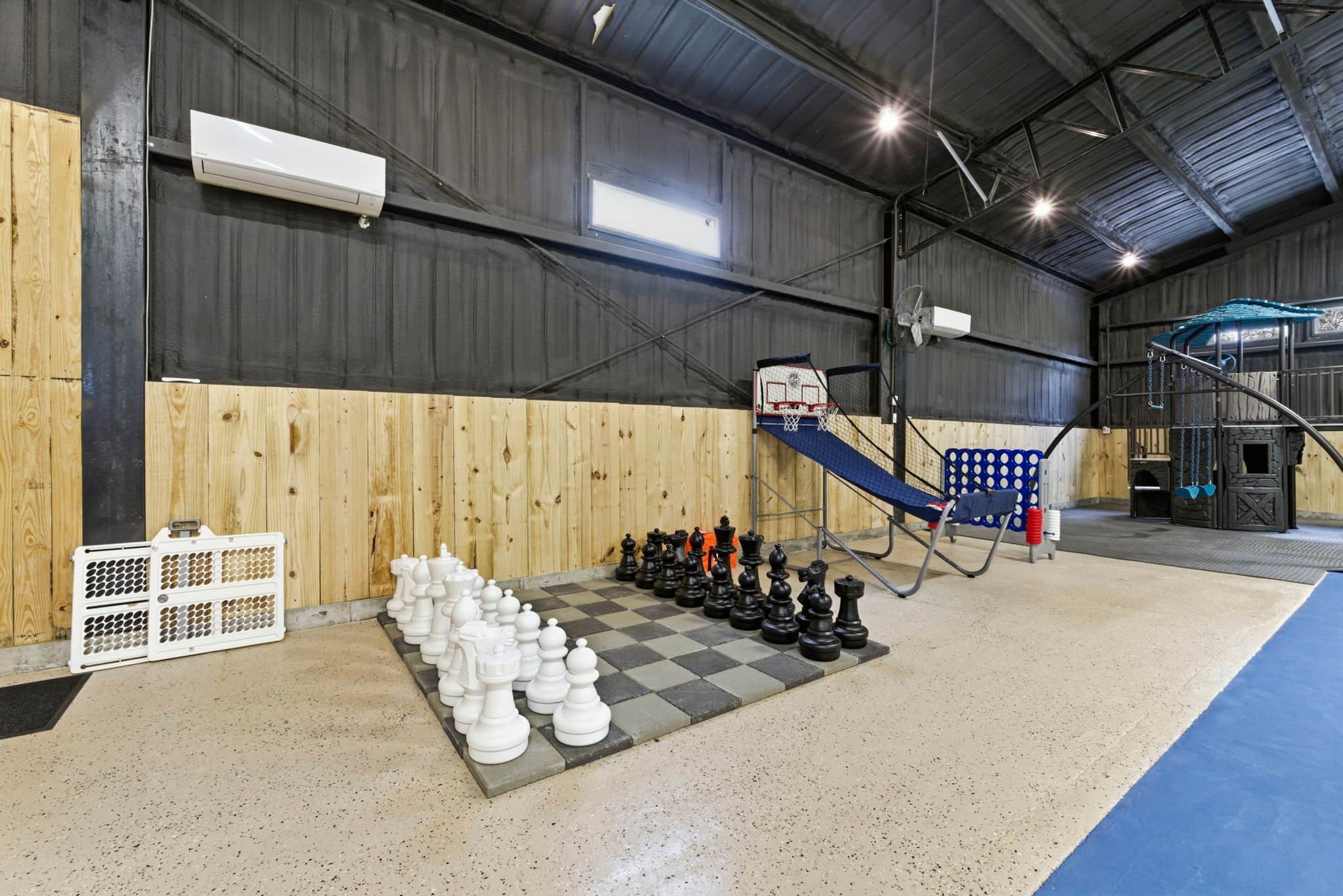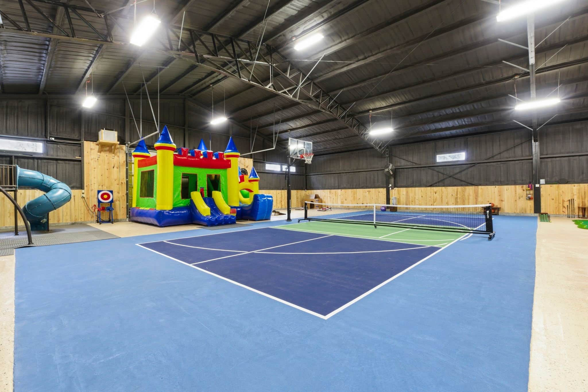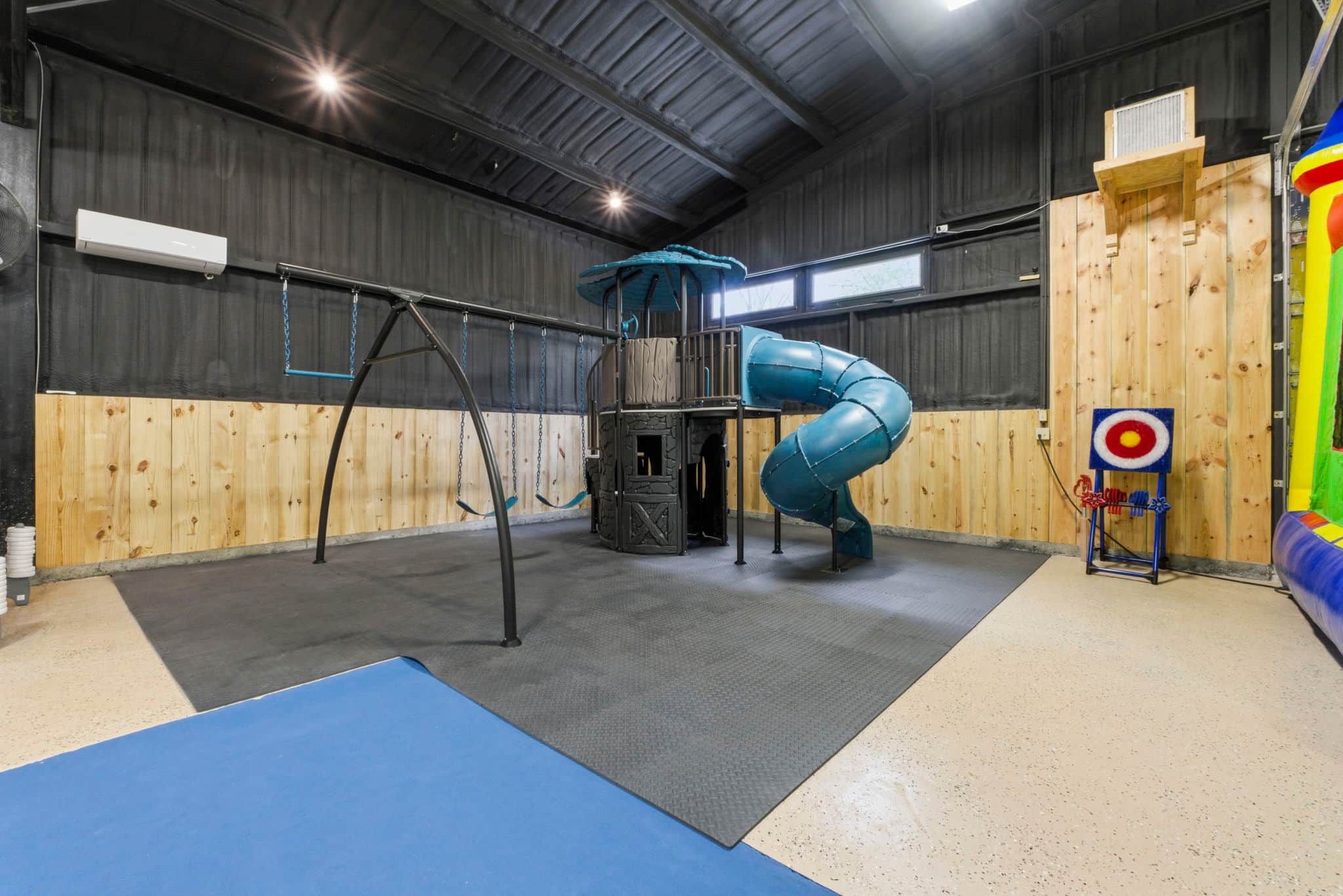 - Full sized play set with swings, rock climbing wall, and tornado slide.